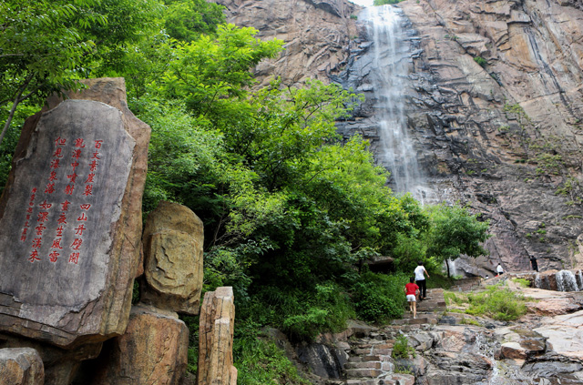 米,水流喷薄吐泻,如云似絮;第二叠由于岩口高凹不平,瀑水分流,如众龙戏水,该叠高