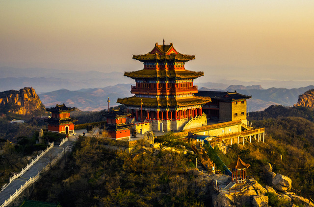 玉皇阁是东镇沂山的标志性建筑。该建筑为三层景观仿古建筑,总高29米,建筑总面积为683.9平方米,它是一座三重檐十字脊歇山四面加抱厦构成的复合式建筑,阁内供奉玉皇大帝铜质神像,神像高9米,形态威武,举目仰视顿时肃然起敬。供案上摆放着善男信女供奉的精美供品,香烟缭绕,法器显赫,黄幡高悬,庄严肃穆。