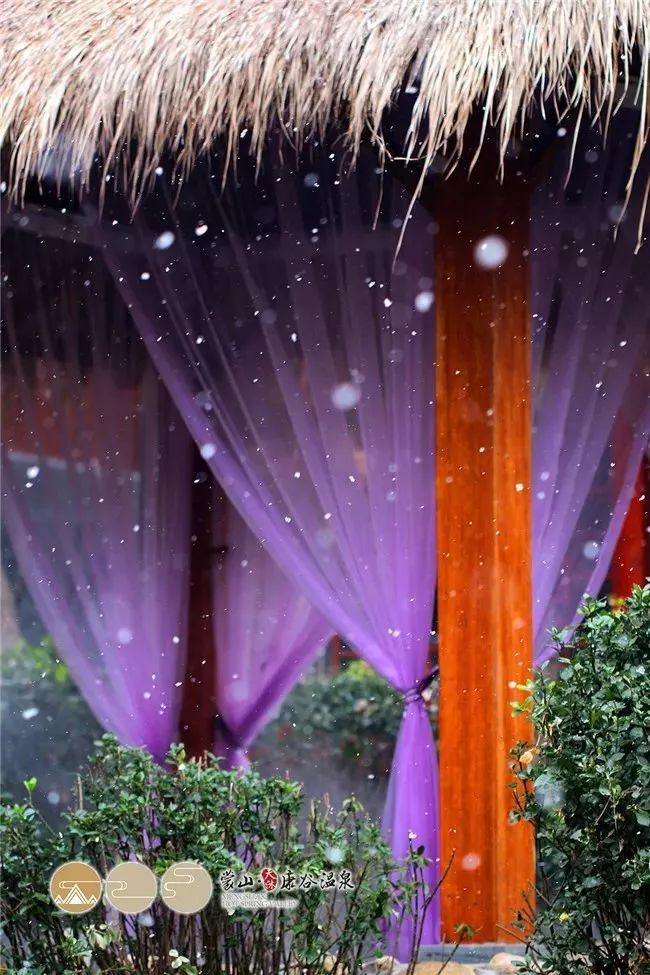 轻帷暖帐中,迷离看人间。周遭绿树错杂、温泉掩映,隔离了时空,错乱了季节。如果不是雪花飘然而下,仿佛已经忘记身处隆冬。