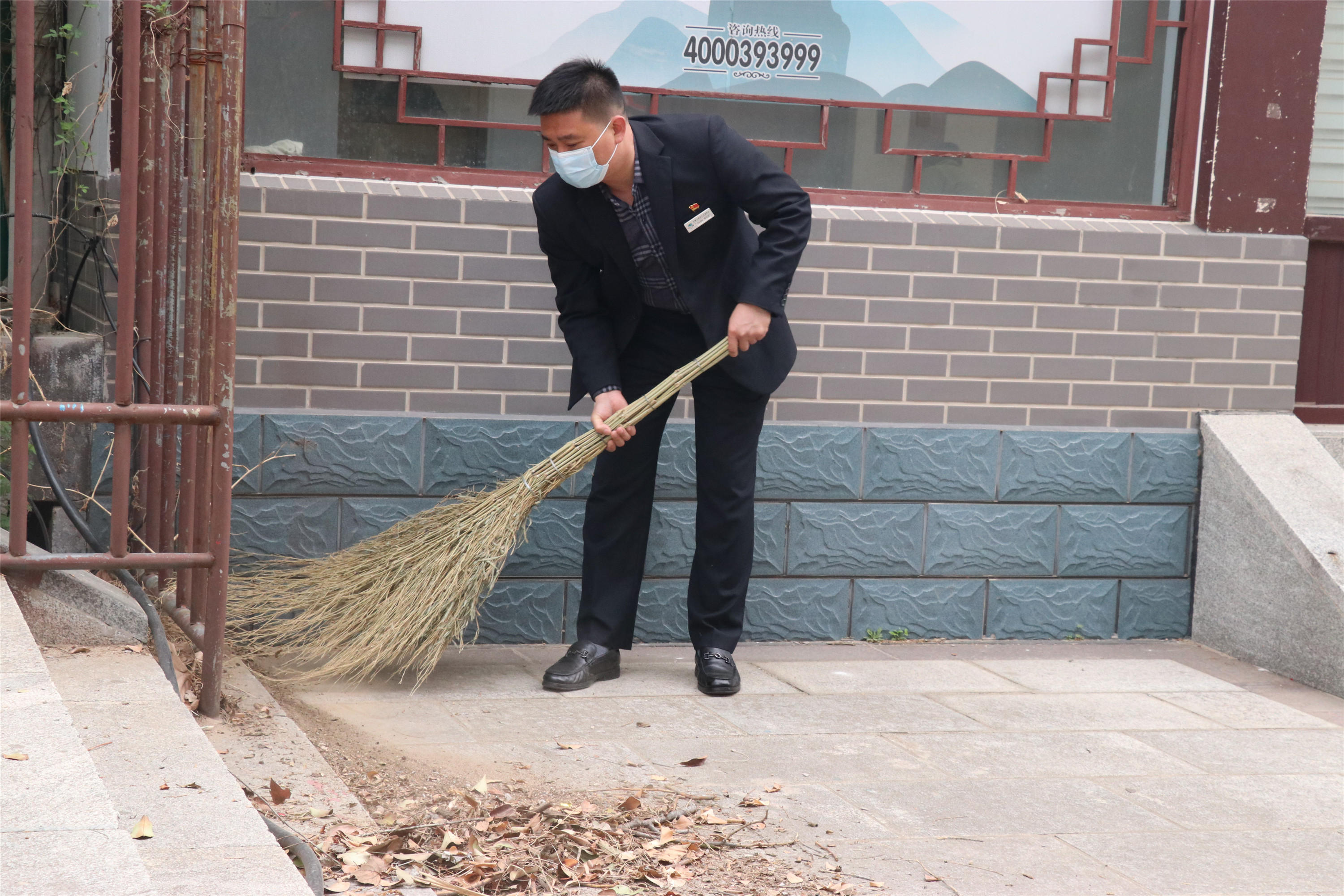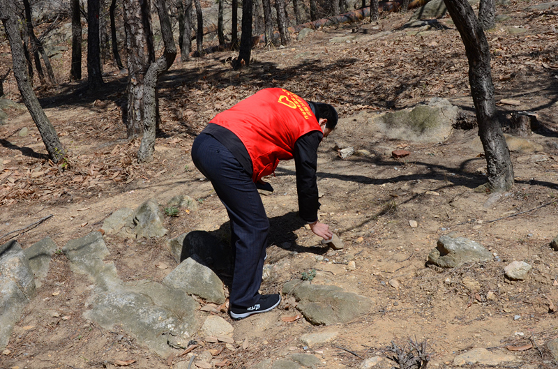 △志愿者们挥舞着扫帚认真的清理着车行道中的树枝树叶等垃圾,为上下山的车辆安全提供保障。
