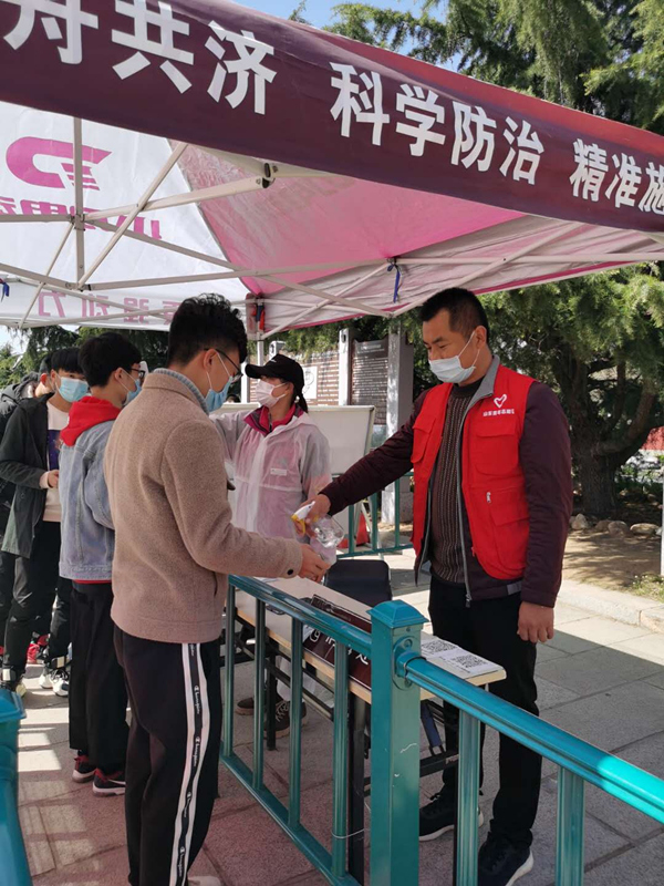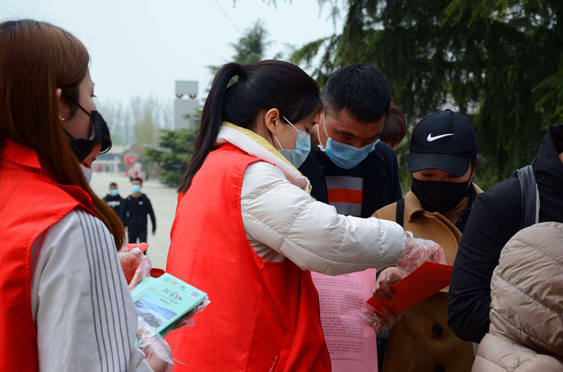 △身穿红色马甲的志愿者为游客普及疫情防护知识,引导其入园,并对入园游客进行消杀防疫