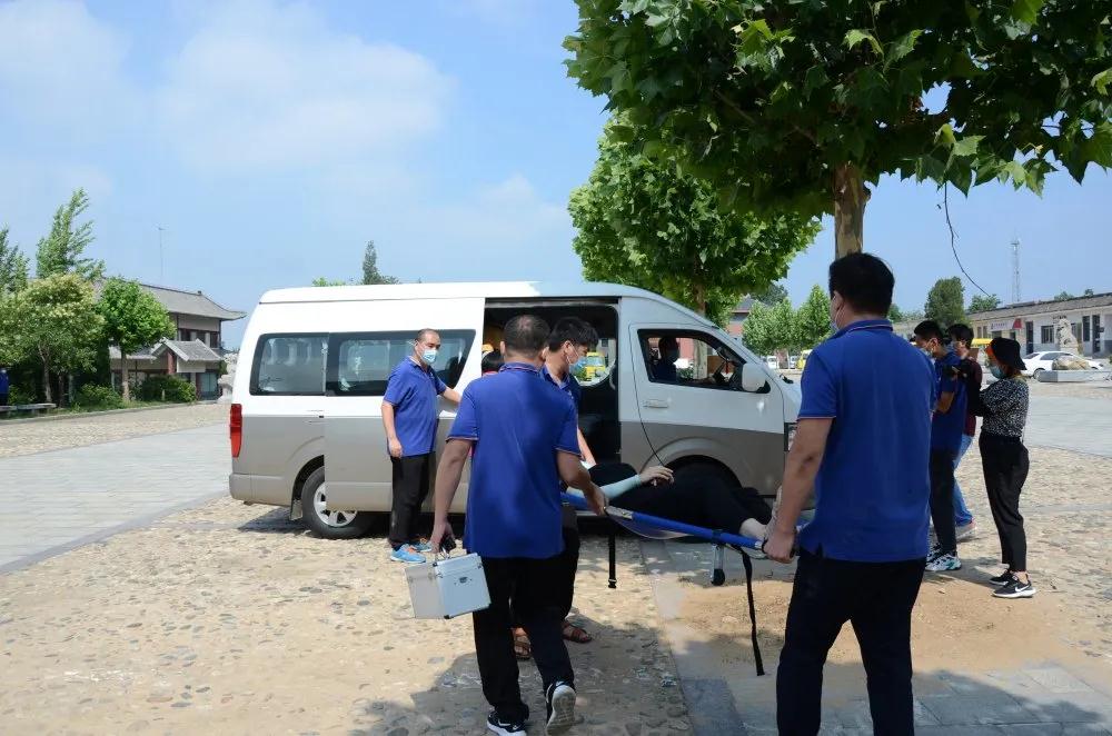▲模拟救护车到达现场,将伤员送往医院接受治疗
