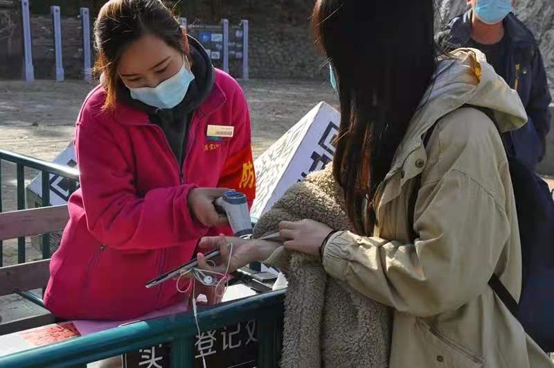 为切实维护景区及游客安全,全面保障游客舒心、安全游园,景区对所有入园游客实行“一日一进一测一登记”,并设置1.5米安全距离隔离,提醒游客佩戴口罩,安全有序排队。实名购票,查验身份,体温检测、消毒检查、做好游客入园流程须知的讲解、查看山东省健康通行卡(码)等,落实规范好每一项入园流程,保证游客安全、顺利、有序进入景区。
