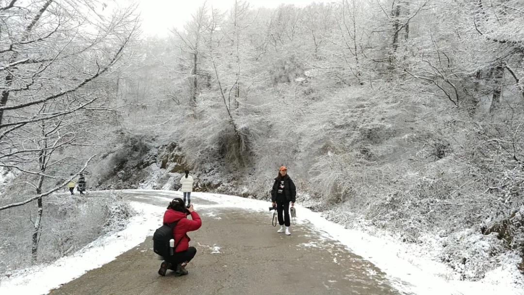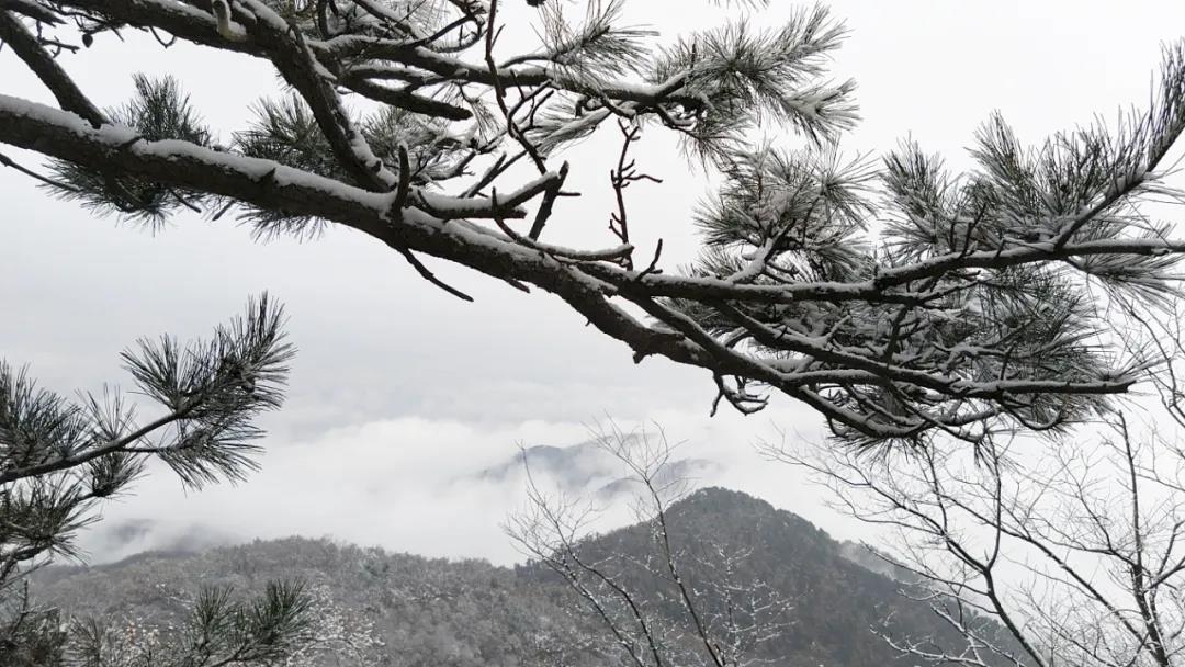 峭壁上松树犹如披上一件洁白的礼服,路面上就像铺了一床床洁白的棉花絮,晶莹剔透的雪花,挂在苍翠欲滴的松树枝头,灵动而晶莹,犹如万树梨花开。