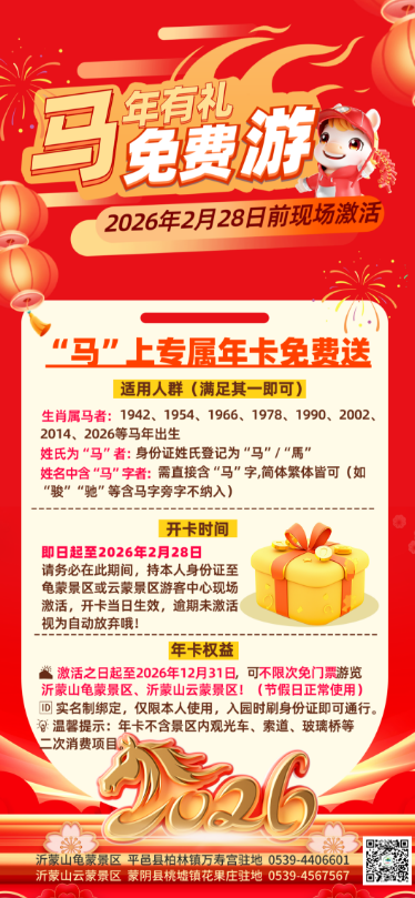 2026新春将至,万象更新2026丙午马年踏步而来蒙山为广大游客送上了一份饱含心意的新年大礼“马”上专属年卡免费送!无论您生肖属马、姓氏为马还是名字中带有“马”字即日起至2026年2月28日前至沂蒙山龟蒙景区/沂蒙山云蒙景区现场激活即可获得双景区全年免票游的特别福利!