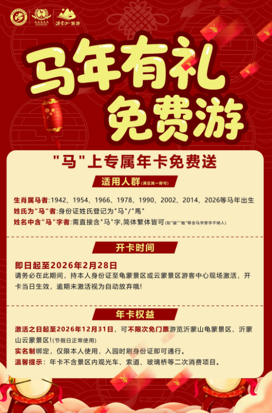 即日起至2026年2月28日至沂蒙山龟蒙景区/沂蒙山云蒙景区现场激活即可获得双景区全年免票游的特别福利!