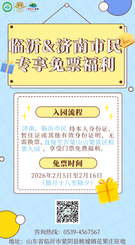 1. 免票对象:济南、临沂市民,持本人身份证、暂住证或其他有效身份证明即可入园。2. 活动时间:2026年2月5日至2月16日(腊月十八至除夕),逾期不再享受此福利。3. 其他说明:免票仅针对沂蒙山云蒙景区门票,景区内二次消费项目需另行付费。
