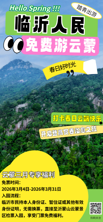 人间三月,春意渐浓沂蒙山云蒙景区向全体临沂市民发出春日盛邀:2026年3月4日—2026年3月31日临沂人免票游云蒙!家门口的5A级仙境零门槛畅玩整个三月!