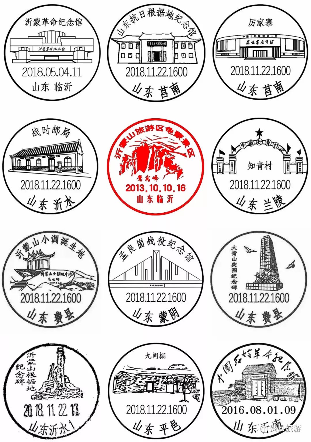 为更好地弘扬红色文化,挖掘红色旅游资源,宣传红色旅游基地,临沂市邮政公司于11月22日统一启用12枚红色旅游风景戳。其中,沂蒙山旅游区龟蒙景区的鹰窝峰,作为临沂市的标志性景观“C位出道”了!