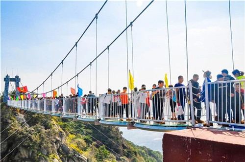 蒙山5D全透明玻璃桥自建成以来,便成为众人青睐的网红打卡地点。特别是今年初秋升级为声、电、光一体的5D效果后,更是引来无数游客流连驻足。玻璃桥横跨峡谷之上,将山峦间的风景展现的一览无遗。在桥上,不仅可以全程体验“悬空行走”,更能体验玻璃碎裂时的惊心动魄!