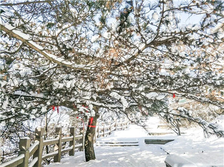 这一场冬日的旋律里,皑皑冰雪遍铺峰峦,处处银妆素裹。破石而生的松树,盘结于峰崖上,俯仰卧立。阳光给它们抹上色彩,山风吹过,掀起一阵雪雾,仙袂飘飘,好似仙境。